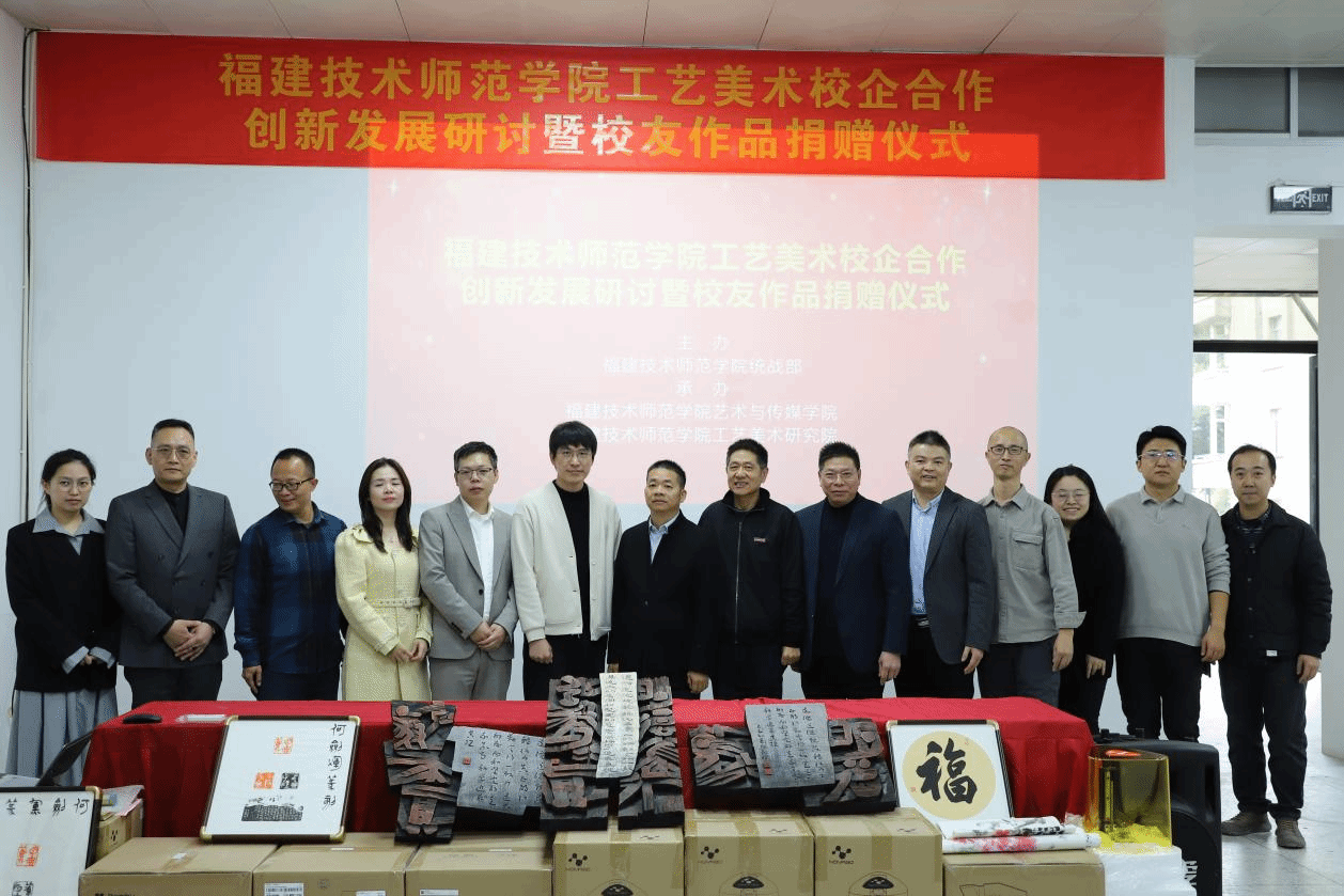 12月27日下午,工艺美术校企合作创新发展研讨暨校友作品捐赠仪式在我校石竹山校区工艺美术研究院举办。福建万象三维科技有限公司总经理张细明,中国书法家协会会员、福建省书法家协会理事、福建省篆刻学会副秘书长93届校友何剑辉,国家金属摆件工职业技能标准主要起草人、中国轻工珠宝首饰中心专家委员会委员、福建省雕塑学会副会长、东方工匠(厦门)文化创意有限公司创始人、2007届校友陈沿淼及杨娟娟女士,中国轻工珠宝首饰中心职业技能评价专委会执行主任、福建省技能大师、福州大学工艺美术研究院珠宝玉石研究所所长、厦门市工艺美术协会执行会长王玉锋,全国技术能手胡蔓玲,校党委统战部部长、艺术与传媒学院党委书记郭永云,艺术与传媒学院陈致烽副院长(主持工作),工艺美术研究院院长、中国工艺美术大师陈礼忠出席。工艺美术专业教师代表及专业学生代表参加活动。
